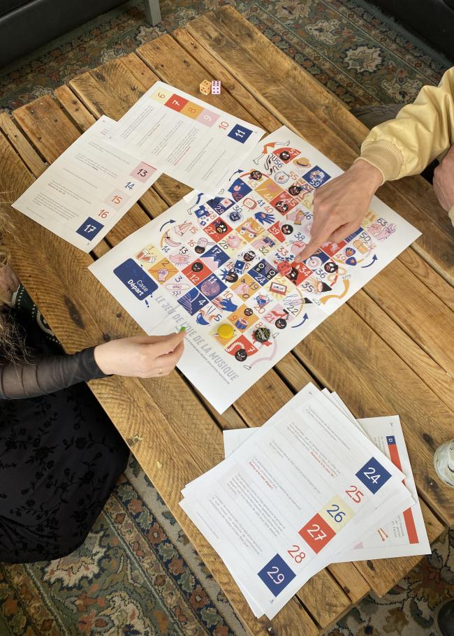 Comme dans un jeu de l'oie classique, on avance de case en case en lançant les dés. La particularité ici, c'est que du départ à l'arrivée, on est confronté·e à différentes étapes de la vie de musicien·ne: de la première date dans un bar moisi, au premier enregistrement, en passant par les disputes au sein d'un groupe.