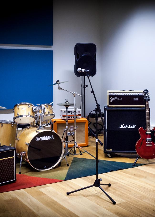 - the three studios have backline equipment (amps and drums) and a sound system. They are connected to a control room with recording equipment: a computer, a mixing console, speakers...