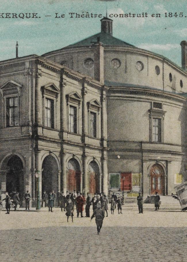Déjà voisin des 4EC, le théâtre de Dunkerque construit en 1845 : porche abrité, loges du maire, du sous-préfet, du général et autres par abonnements tirés au sort qui créent la concurrence des mondanités, plus 1200 places du parterre au paradis. Haut lieu de l’oreille et du brouhaha bihebdomadaire, le théâtre est à la disposition de la municipalité pour ses cérémonies et évènements de charité, et à celle du directeur délégataire d’octobre à février.